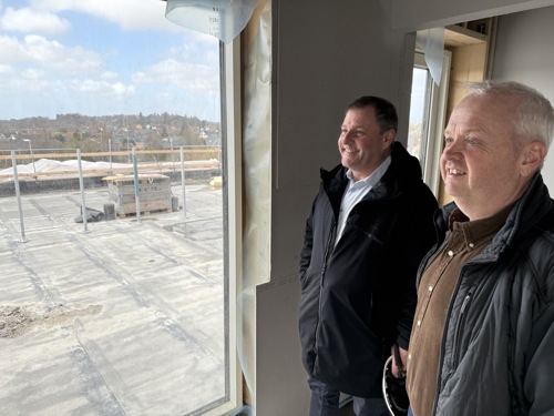 Billedet til venstre: De to ejere af FLY Ejendomme Frederik Hansen (til venstre) og Tomas Andreassen glæder sig til at kunne slå dørene op for lejerne i det kommende kontordomicil, som på 2. sal kommer til at have udgang til en terrasse.