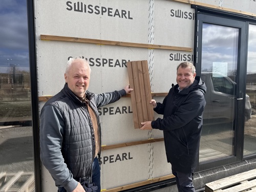 Billedet i midten: En del af den udvendige beklædning udføres i Termo Wood – asketræ, som både giver et naturligt udtryk og reducerer miljøbelastningen. Beklædningen vises frem af de to ejere af FLY Ejendomme Tomas Andreassen (til venstre) og Frederik Hansen.